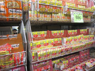 何か掘り出し物がないだろうかと店内を見て回りましたが、何かヘン。2階には電化製品があったりしてそもそも99セントではないし…。他にも99セントじゃないじゃんってのがゴロゴロあります。質は日本の100均よりは悪そうで、魅力的な商品はありませんでした。菓子類もおみやげにちょうどいいかなと思うものが見当たりませんでした。インスタントラーメンは99セントより安く、飲み物は1ドルちょっととやや高めでした。もし買うとしてもこの辺の商品かなと思いました。結局はバッグだけの購入でした。