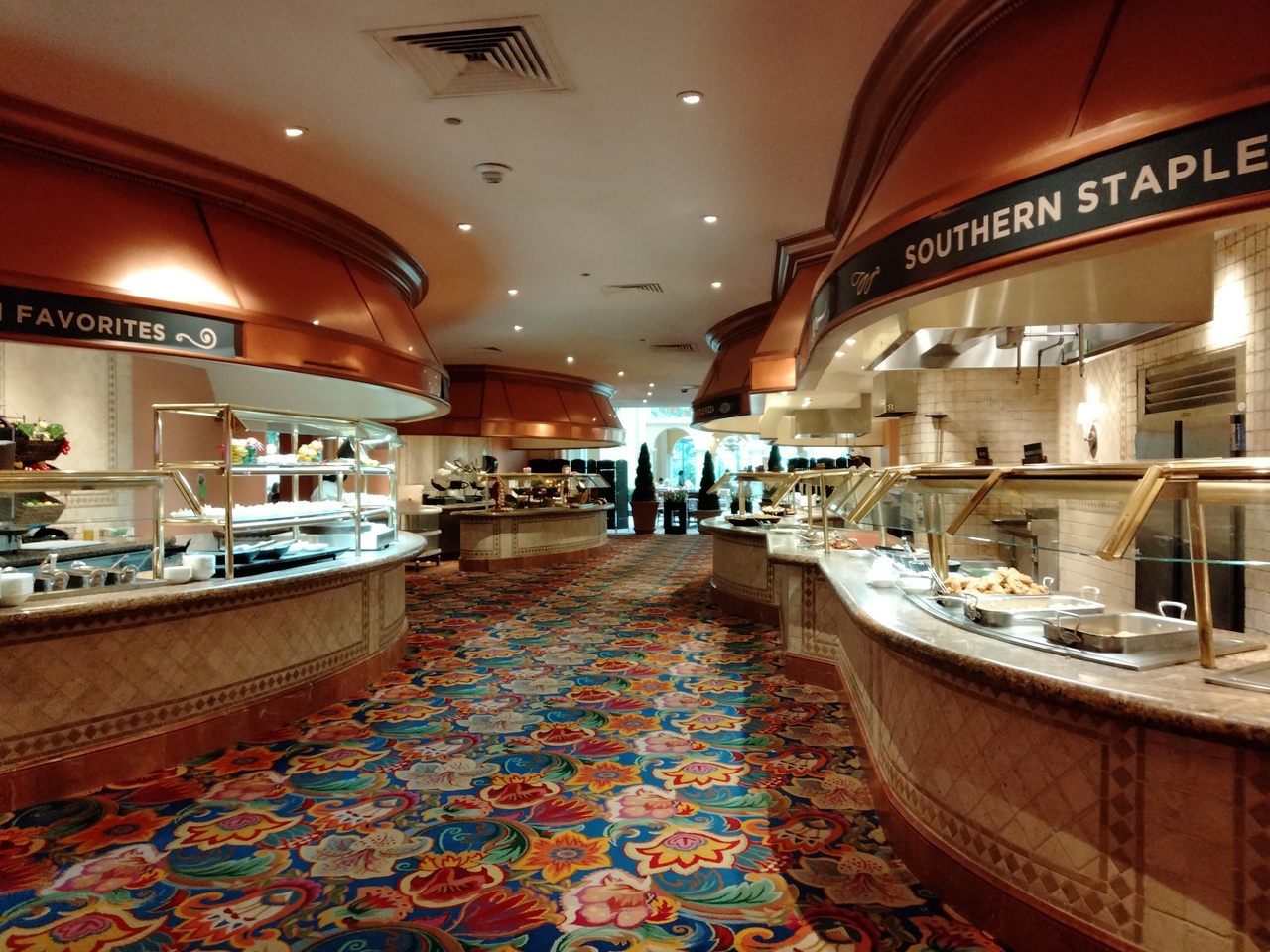 予約はできないので、早めに行って並び整理券を受け取り、整理券の時間に入場する仕組みでした。入場するまで1時間ほど待ちましたが、ホテル内のモールやカジノを散策したり過ごしました。先にビュッフェと飲み物の会計を済ませて席に案内されます。お肉にシーフードと盛りだくさんで大満足、食べすぎてしまいました。
