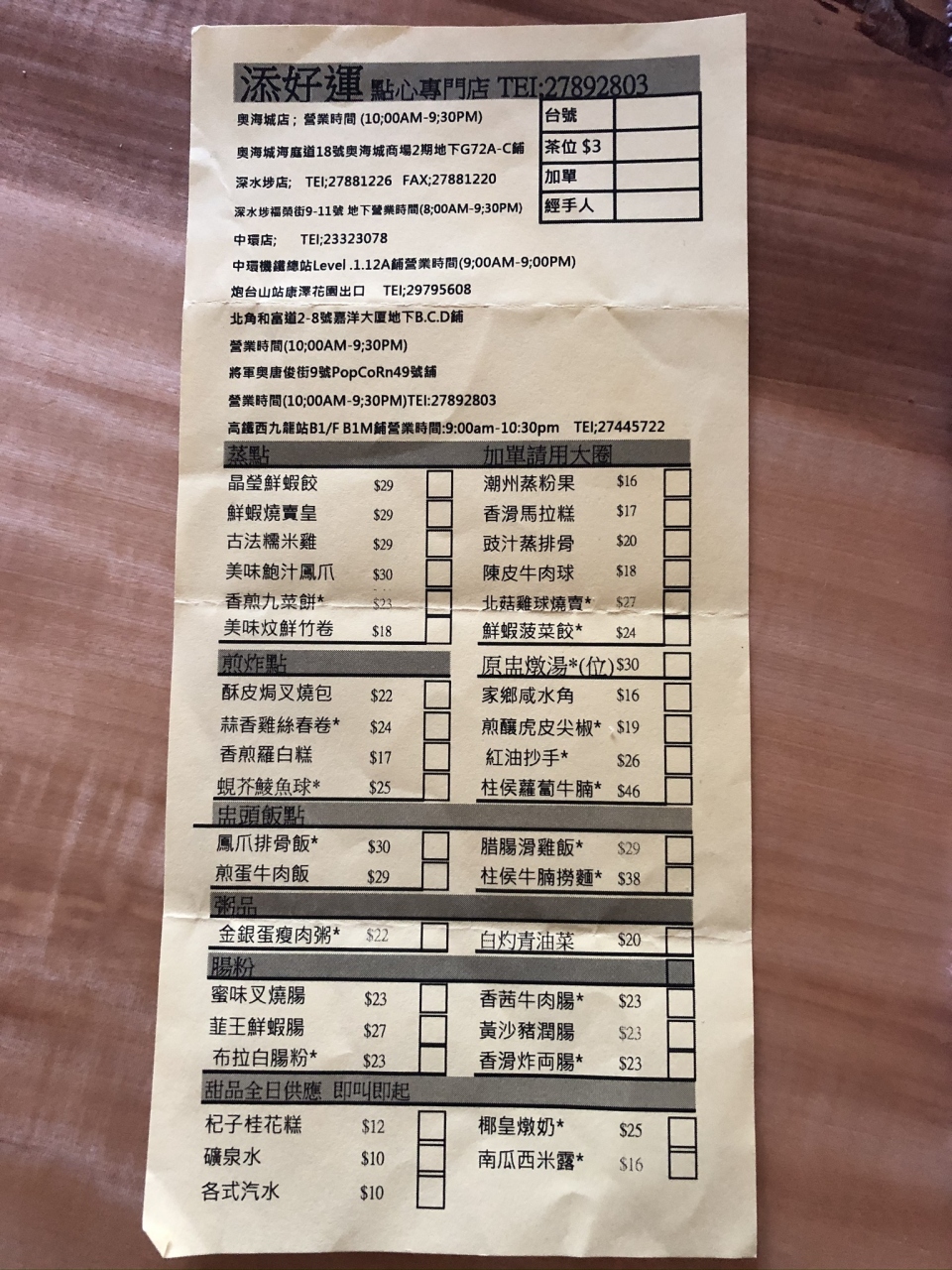 中に入るとポップコーンというきれいなショッピングモールの中にあるだけあってとってもきれいですが、お客さんはローカルばかり。テーブルにつくとメニュー表に鉛筆でチェックを入れて店員さんに渡すと料理が運ばれてきます。テーブルには食器とレンゲ、箸がおかれており、みんなお茶が届くとそのお茶でじゃぶじゃぶ食器を洗い出します。食器や箸が汚いわけではないのですが、その昔の習慣だそうです。でも周りの人たち全員洗ってました。すべておいしかったです。英語は通じないので、事前にメニューのチェックは必要でした。- 旅行時期