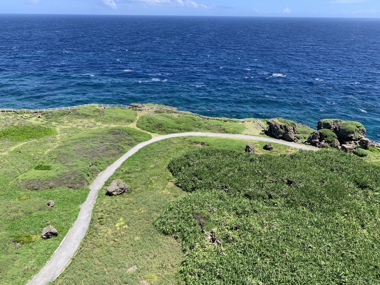 駐車場から先端まで徒歩で行く途中も灯台、海、空、素晴らしい眺望。