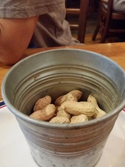まずは席に座るとお通しにバケツに入ったピーナッツにビックリ!そしてメニューを見て値段の安さにまたビックリ!