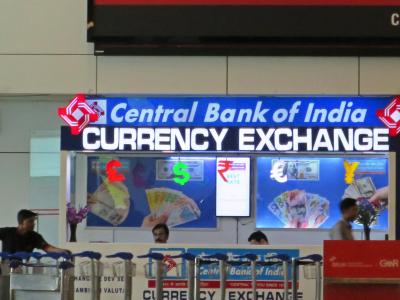 インド、インディラガンディー国際空港の到着階、セキュリティエリア内で円を現地通貨へと両替しました。