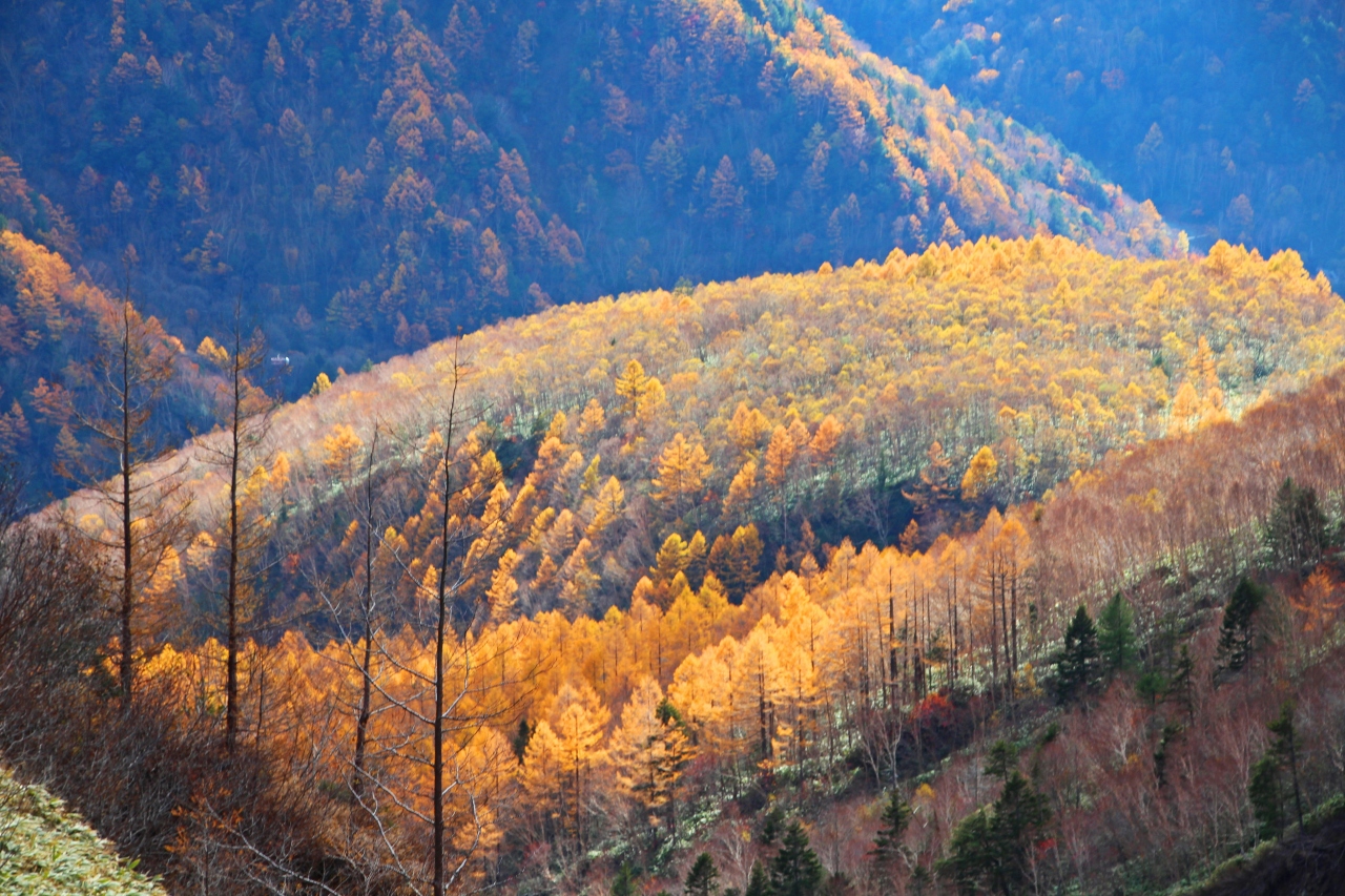 秋が深まるころには、カラマツが黄色~オレンジ色に色つき、まるでアメリカの国立公園にでも来たかのような雰囲気を醸し出す場所です。