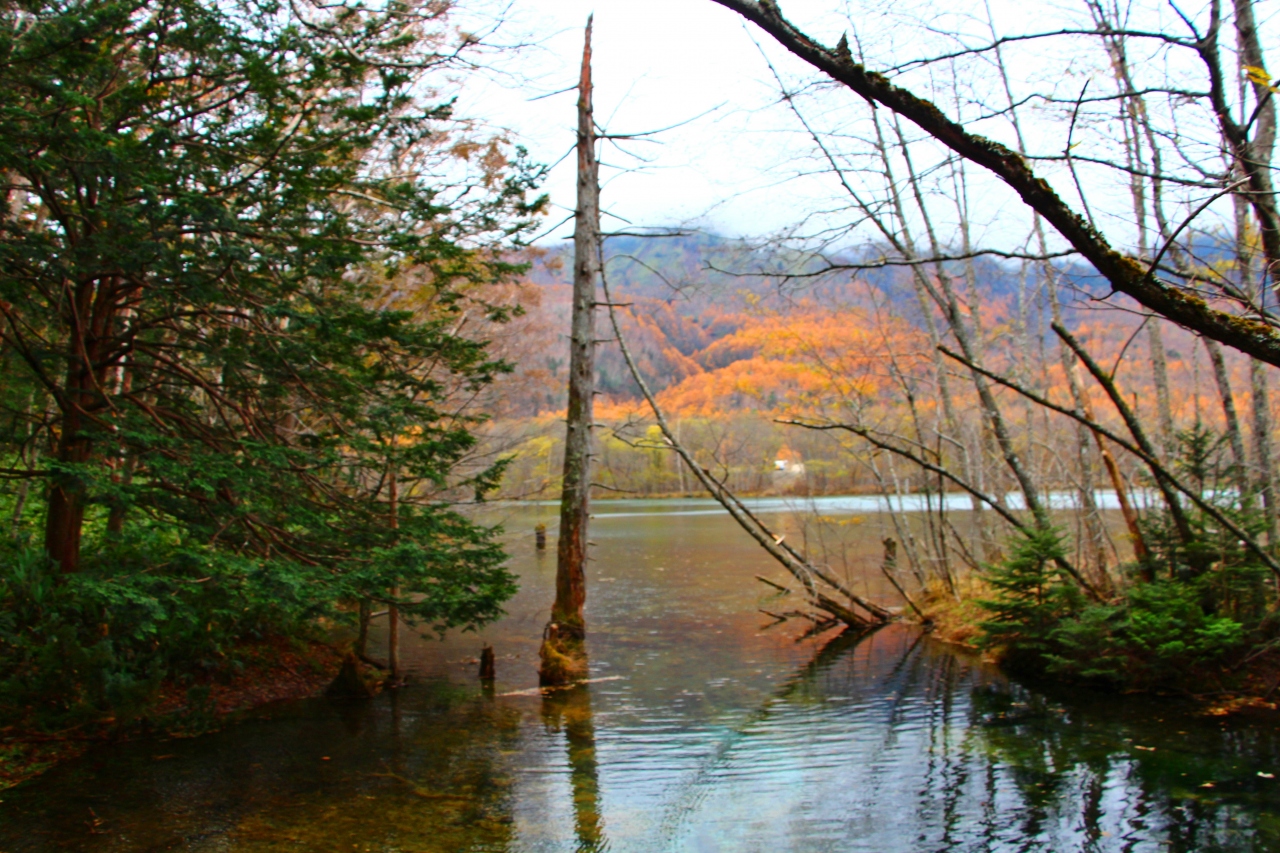 上高地の大正池は美しい池としての前評判も高く、期待して訪れたのですが、紅葉の時期にも関わらず、大正池ホテルの正面から見える池の反対側には、工事車両がドンと居座り、更に、池の左端では大型の重機がボーリング作業のようなポールを池の中に打ち付けていました。