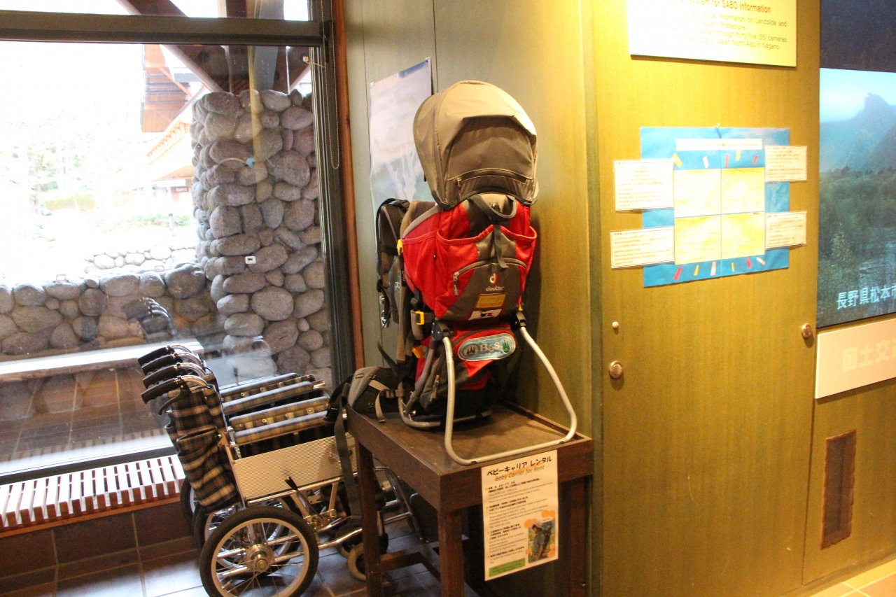 上高地インフォメーションセンターでは車いすと背負子型のベビーキャリーを無料で貸し出しています。