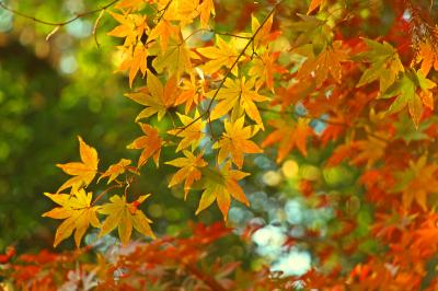 境内林のモミジは日当たりが悪い部分は未だ緑が多かったですが、緑の中にところどころ現れる黄色から赤へと色を変える葉が和の美。
