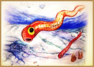 長い間、古生代に生きた未知の生物と言われてきたコノドント生物の化石が展示されています。