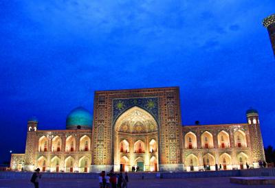 しかし、夜にレギスタン広場のライトアップが始まると、一番存在感が増すのがウルグベクメドレセ。
