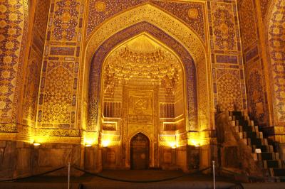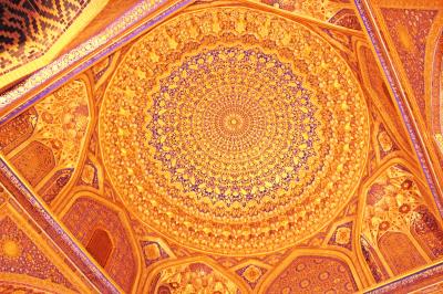 サマルカンドのレギスタン広場にあるメドレセ;ティラカリ メドレセはイスラムの神への捧げものとして建築された神学校で、内部の礼拝堂はその内装に3kgの金泊を使用した豪華絢爛のキンピカ装飾。