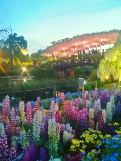 GWなどは駐車場待ち渋滞で4時間待ちなんてこともザラの様で、朝7時前に車で行けば渋滞に合わないらしいが、それでは夜のライトアップされた藤を見ることができない。