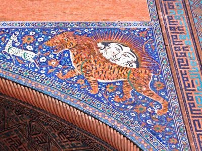 タジク語で「ライオンを持つ者」を意味する名を持つメドレセ;シェルドル メドレセの正面には金色に輝くライオン(背には日輪が輝く)が小鹿を狩るシーンがデザインされている。