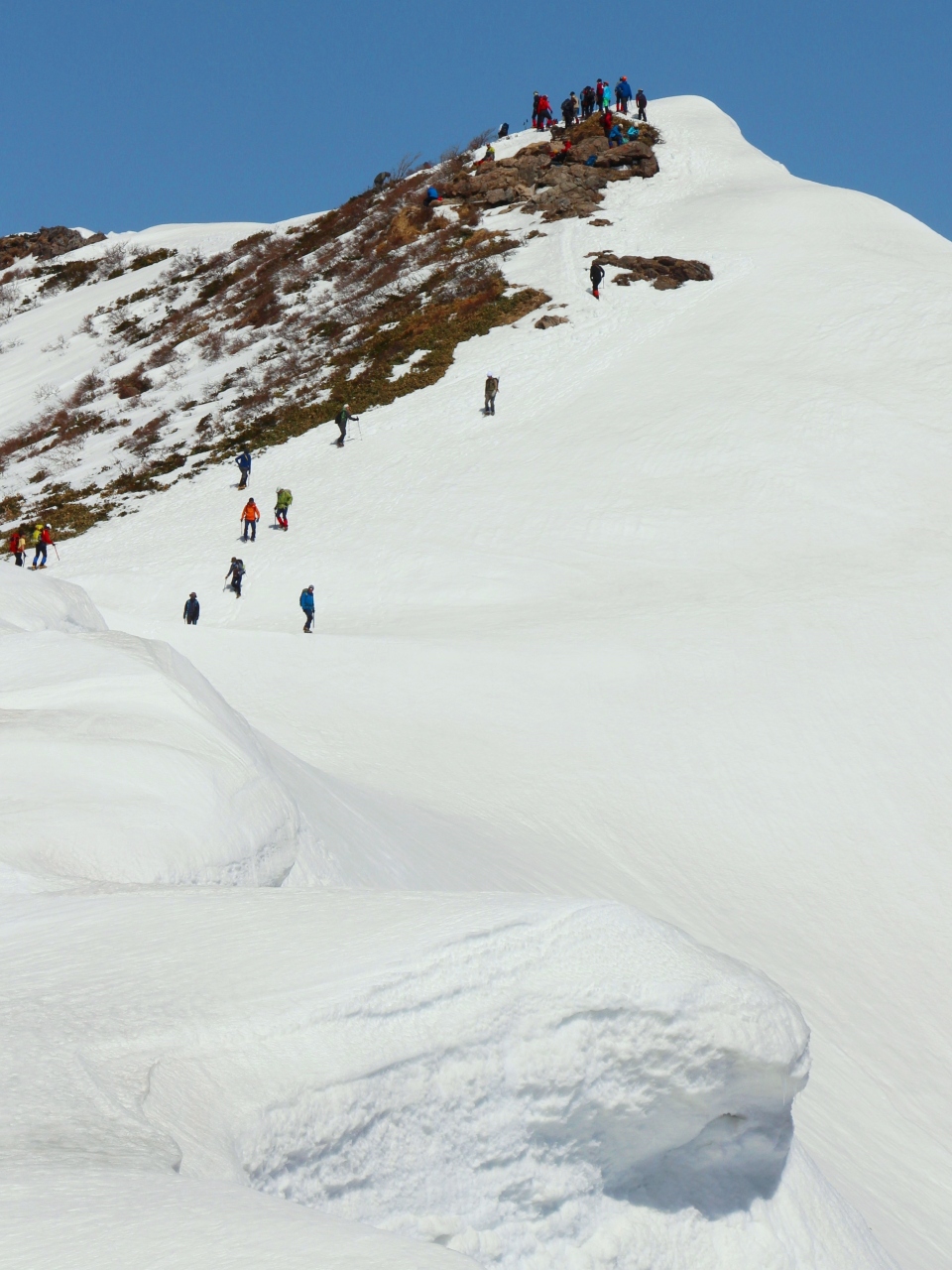 アイゼンとピッケルは必要ですが、3月下旬から4月上旬の時期ならばゴンドラの天神平駅から往復6時間程度でトマの耳、オキの耳まで行くことができ、さらに雪と風が作るナイフリッジの美しい稜線の風景を楽しめます。- 旅行時期