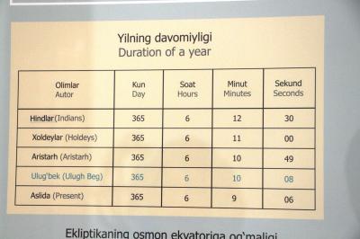 ウルグベクは非常に頭の良い王で王の仕事の傍ら天体の観測にも力を注ぎ、15世紀に1年の時間を現代のコンピューター計算とほぼ同じ位の精度で計算しています。