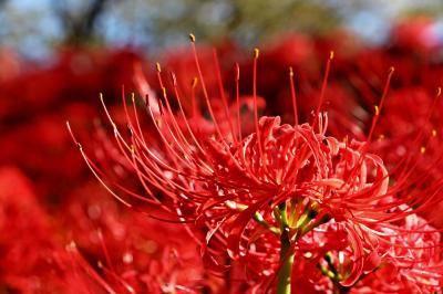 深い紅色の花がサワサワと風に揺れ、まるで赤い川の様に見える曼珠沙華は他の場所では見ることの出来ない景色で、堤に展開するそんなフォトジェニックな光景が見たくて、権現堂公園へと足を運ぶ人も多いと思う。