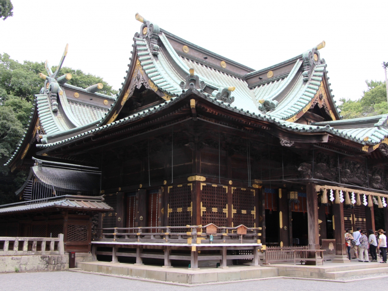 建物の着目点としては拝殿の彫刻がそのひとつで、木像彫刻なので見えにくい部分がありますが、アマテラスが天岩戸から出てくる場面や源頼政の妖怪ヌエ退治の場面などがあります。