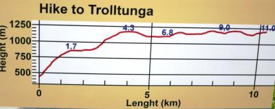 ・トロルの舌への往復のトレッキングの所要時間は公式情報では10~12時間だが、体力があまりない私でも計10時間(登り4.5時間+トロルの舌での滞在1時間+下り4.5時間)で歩けたので、体力のある方ならば、往復8時間も可能。