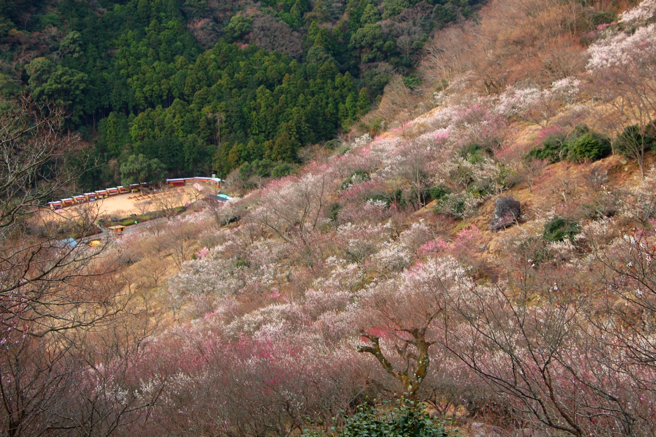 個人的なお勧めは、満開を過ぎた位の日の斜面一面を覆い尽くす梅林の景色でしょうか。
