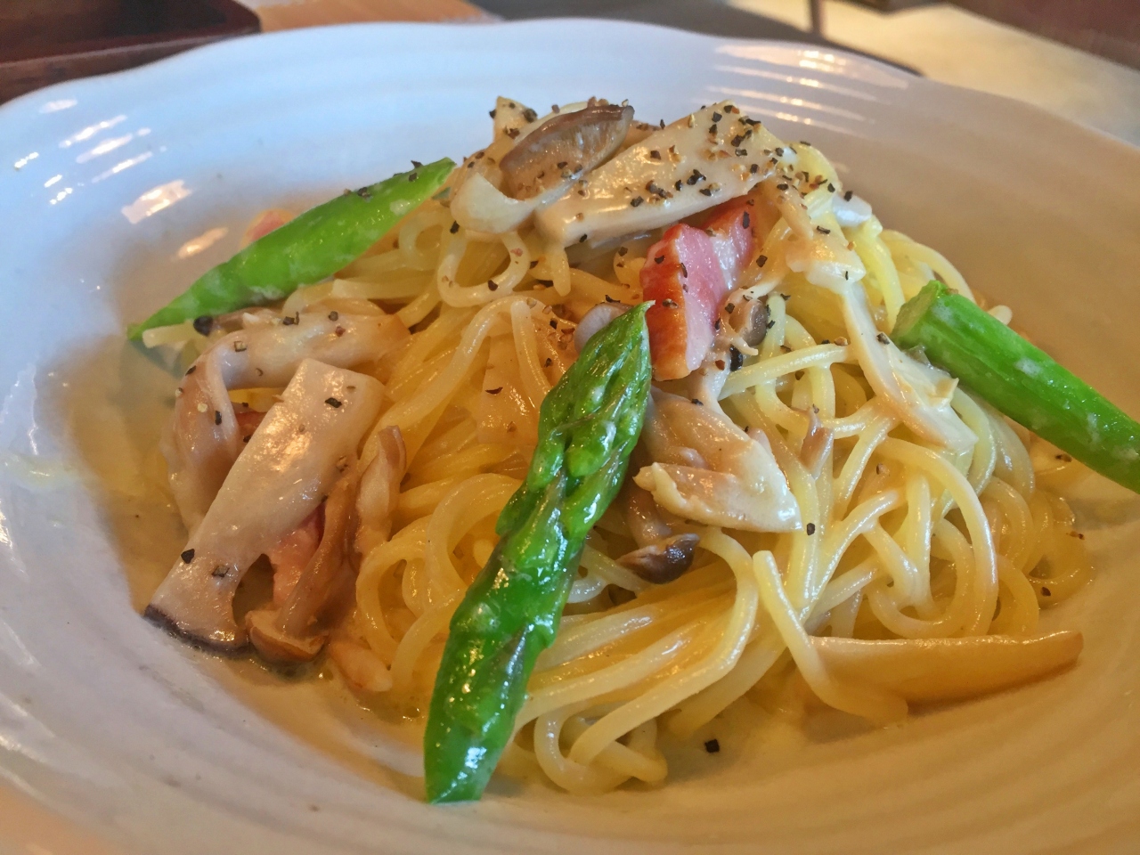 今回、友人と私がオーダーしたのは春のパスタで、シラスの和風ジェノベーゼとアスパラとベーコンのクリームパスタです。