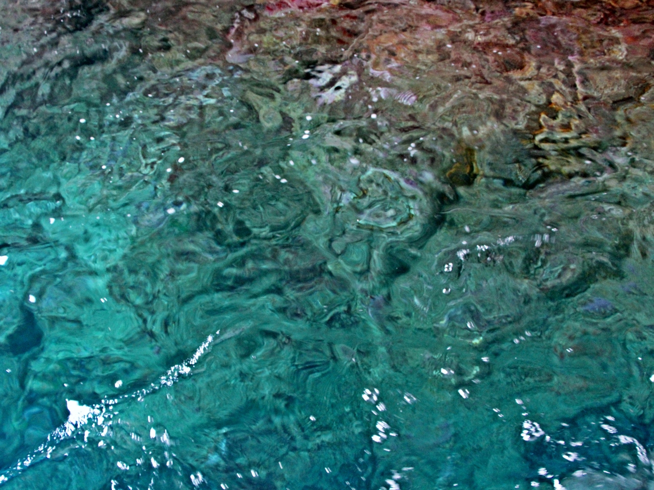 洞窟の入口が大きいので、洞内も明るく、船の下には何メートルも下の海の底が見える様なエメラルドグリーンの水の色がとっても綺麗。