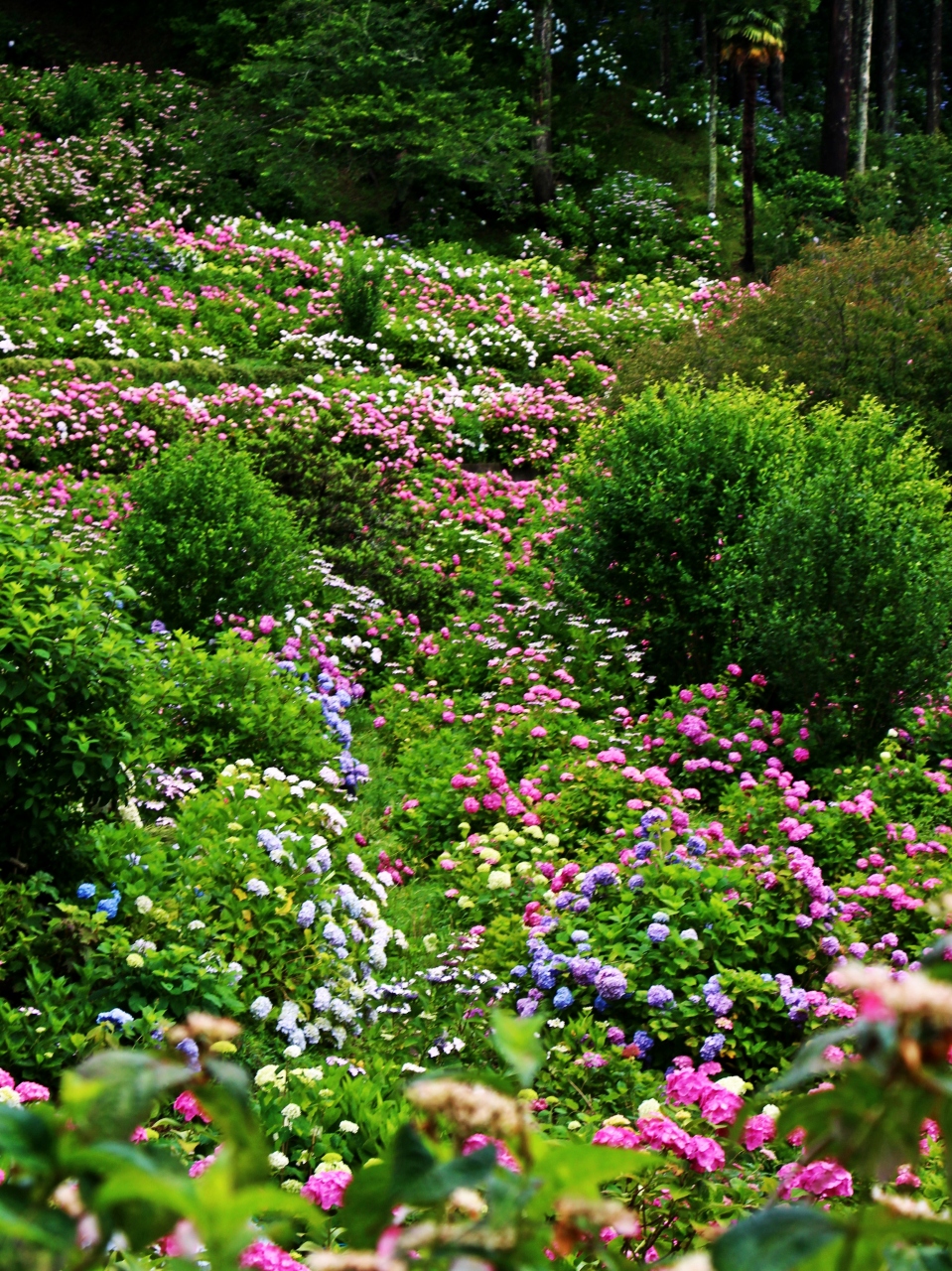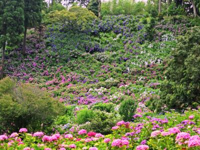 アジサイの咲く斜面を下から見上げると、まるでモネの描く絵画の様な色合い、斜面を山の上から見下ろすと金平糖を空からばら撒いたかのような不思議な世界が広がっていました。