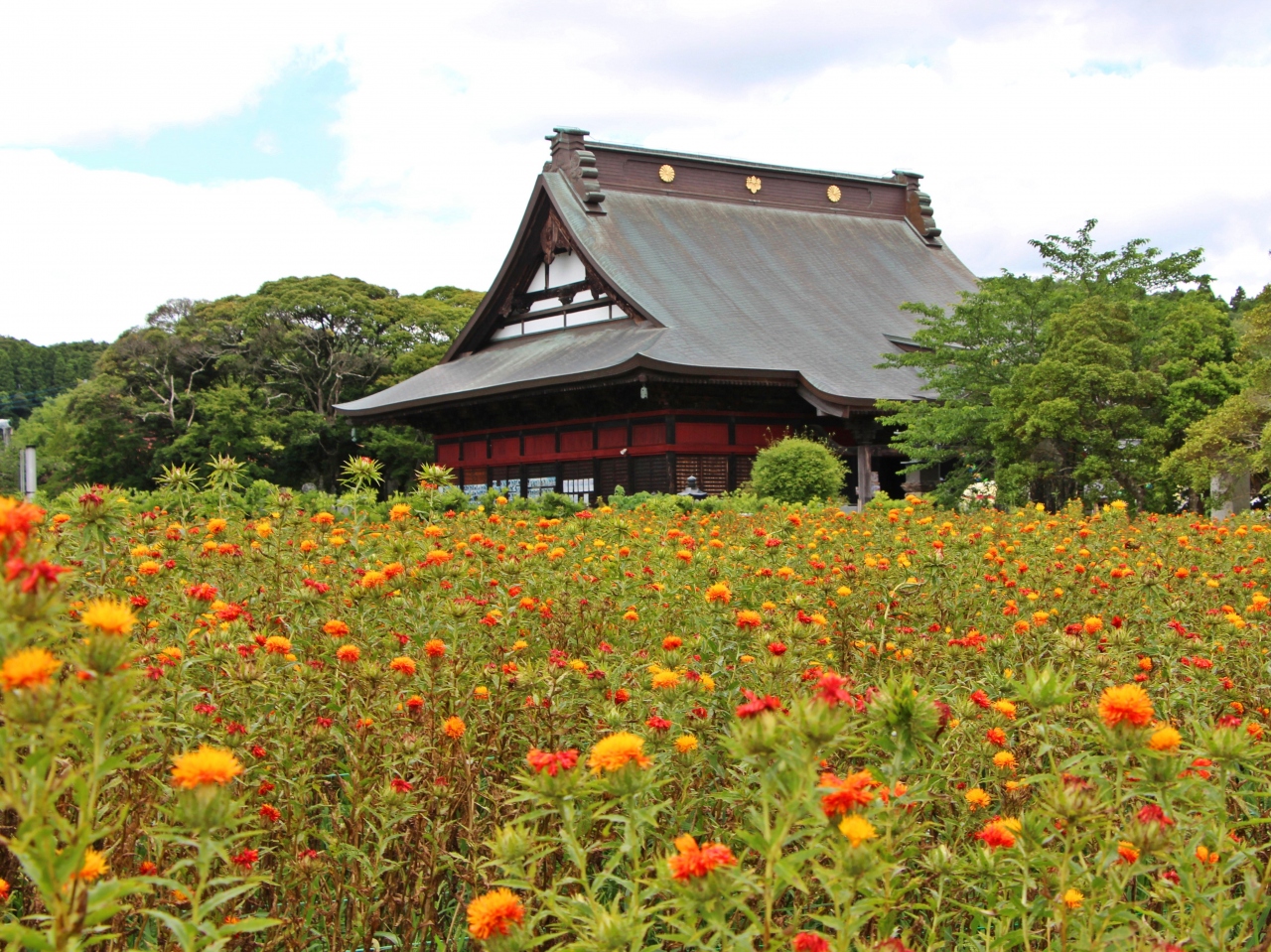 その場所は千葉県の外房地方にある長福寿寺で、お寺の境内に紅花畑があり6月12日に訪れた時はもうそろそろ満開という頃で見事な景観を楽しむことが出来た。