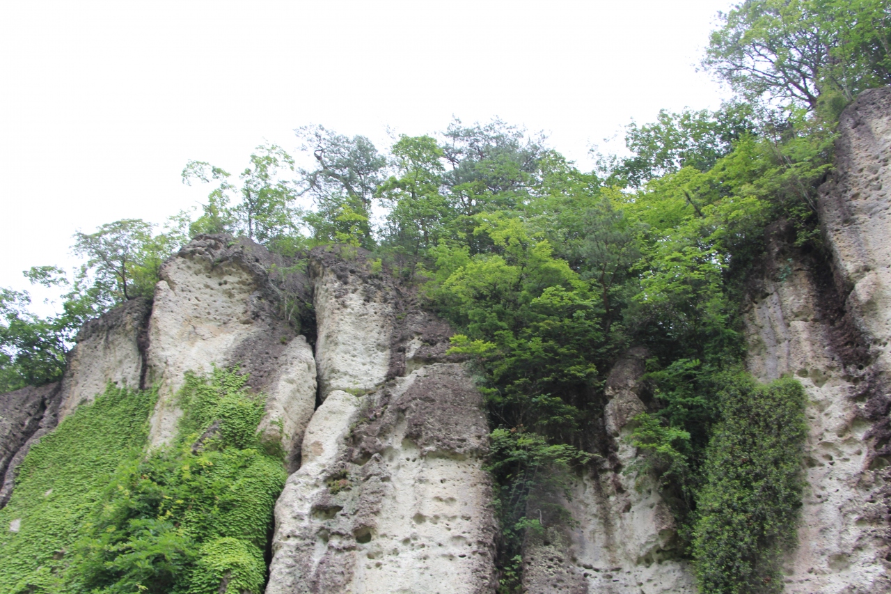 6月に訪れましたが、天狗の投石のまわりの大谷石にはびっしりと木々の若芽が芽吹き、不安定さを売りにしている石は、かろうじてその姿が緑の間に見える程度でした。