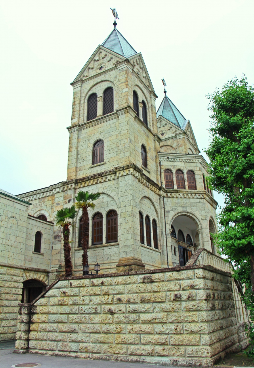 昭和初期に建てられたロマネスク様式で、外壁は総大谷石で作られています。