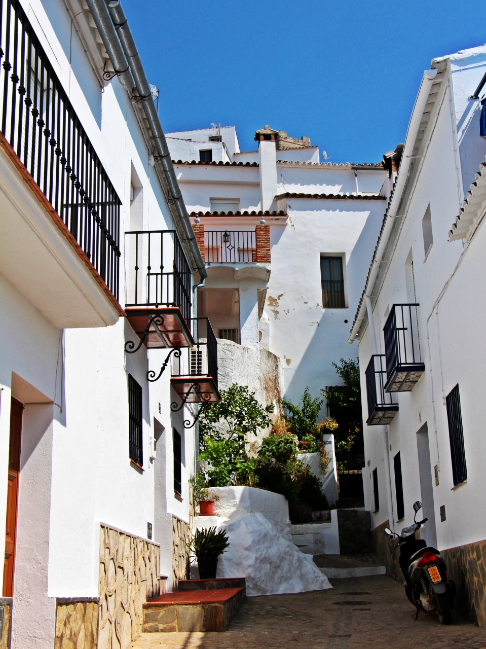 スペイン・アンダルシア地方の白い村…と云ってパッと私達の脳裏に浮かぶのは、ミハスの坂道の光景:白い玉石が作るモザイク模様の石畳に、白い壁の家々が立ち並び、その白壁にはカラフルな絵皿や植木鉢が飾られている光景ではないだろうか。