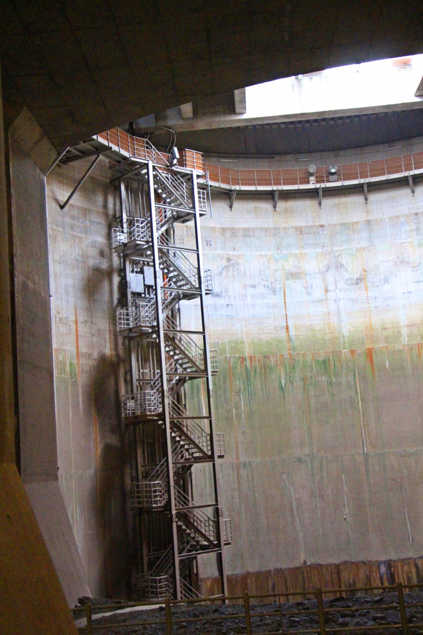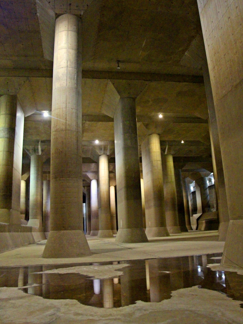 首都圏外郭放水路は5本の垂直な立坑を結ぶ6.3kmのトンネルと巨大な水槽から構成されている。