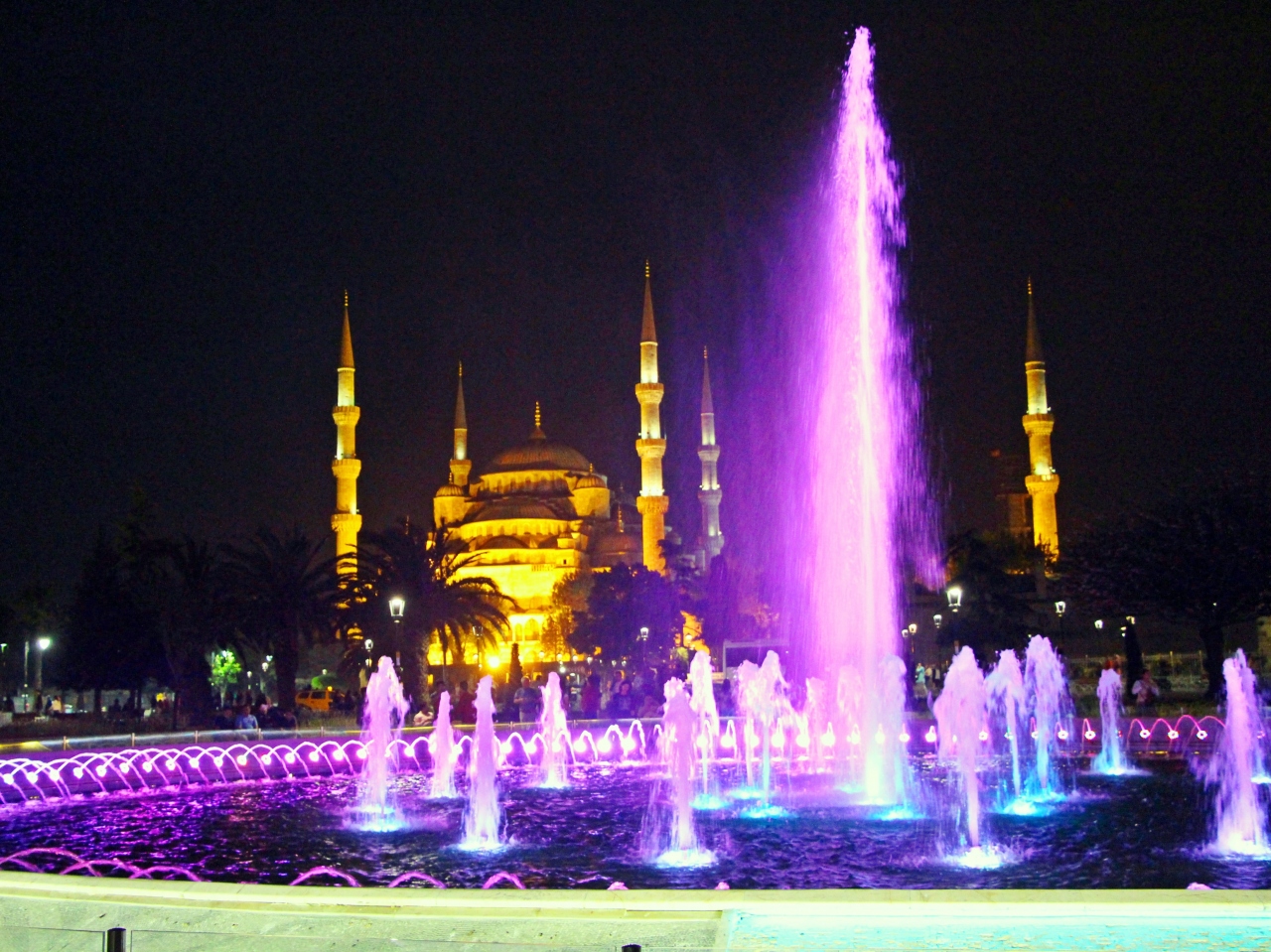 また、夜は広場の噴水もライトアップされるため、噴水越しのブルーモスクの姿も綺麗だ。