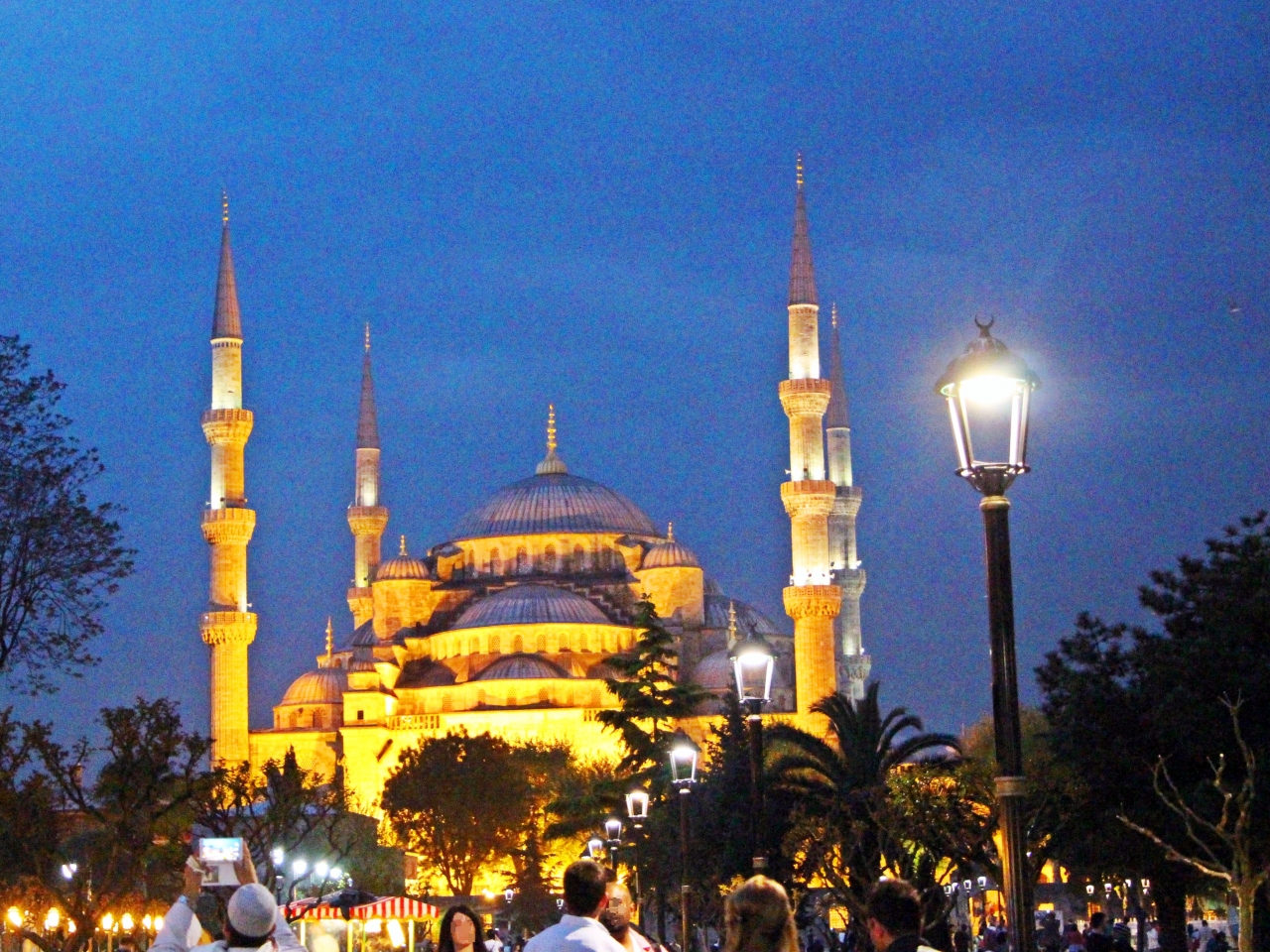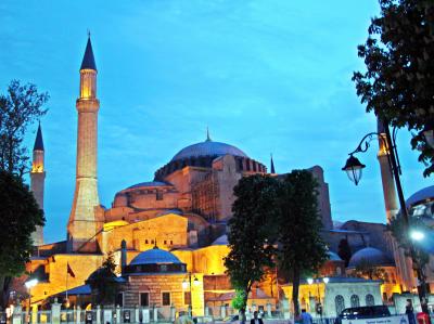 夕方、夜の帳が下りる頃、アヤソフィア、ブルーモスクのライトアップが始まり、アヤソフィアの紅い姿、黄金色に輝くブルーモスクの姿が夜の闇の中に浮かび上がる。