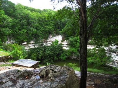 セノーテへの道の突き当りはストンと垂直に落ちる崖になっていて、その崖下に聖なる泉であるセノーテがある。