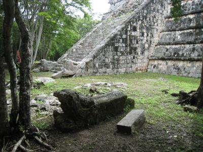 遺跡の周りの密林の中には、朽ちて台座から転げ落ちたククルカンの頭部も無造作に転がっていて、ジャングル探検の気分もさらに盛り上がる。- 旅行時期