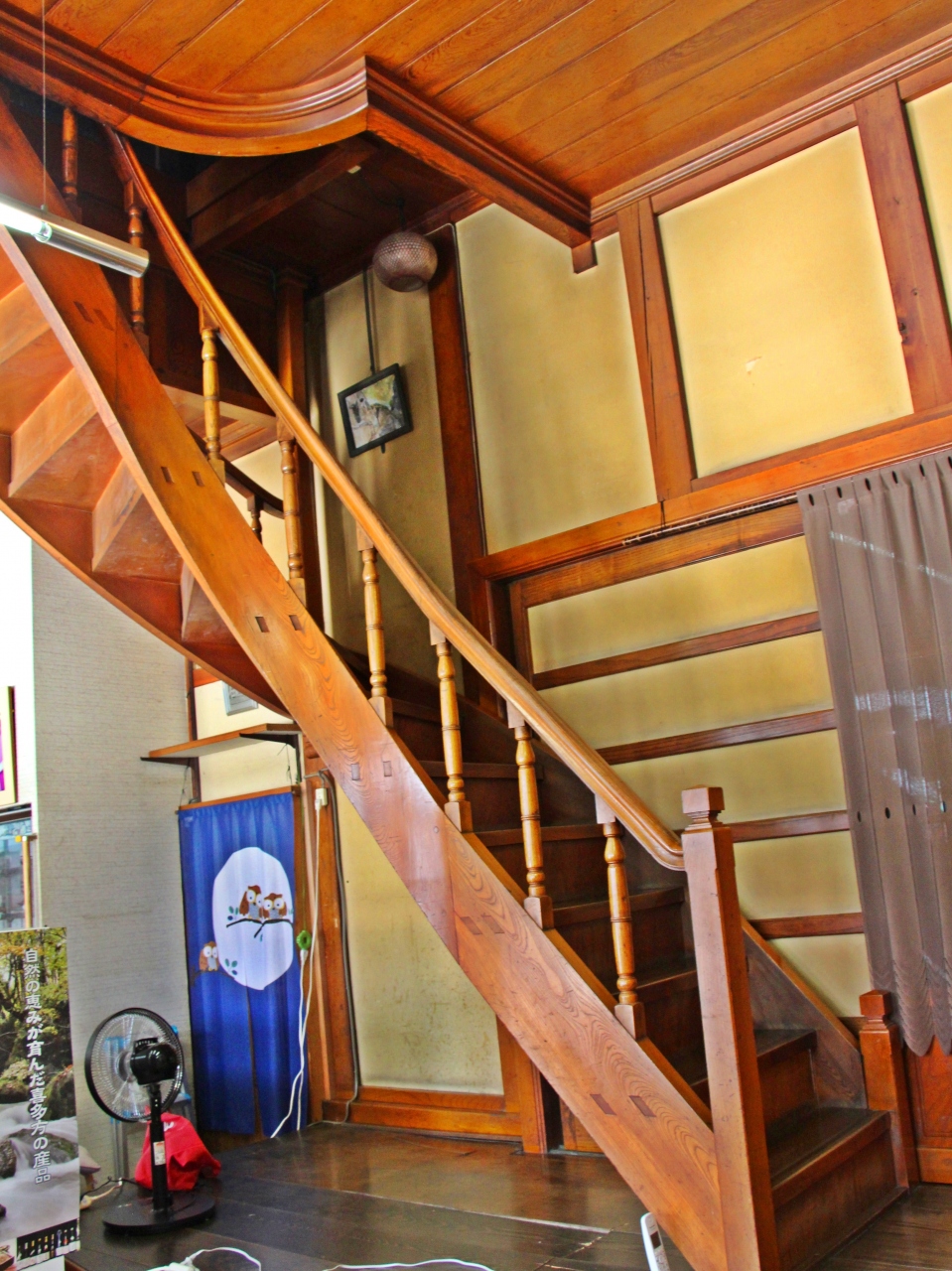 踊場のない優美な曲線を描く吊階段は、正面、そして背後からその姿を見ると、削り出した木板をしならせ作ったその姿に感動すると思う。- 旅行時期