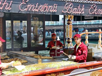 ガラタ橋の袂の船の上で販売しているサバのサンドイッチであるサバ・サンド。