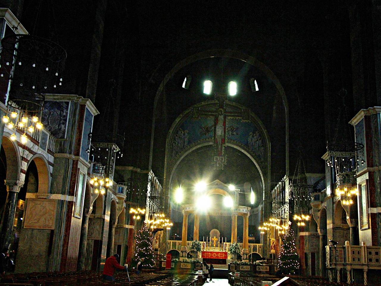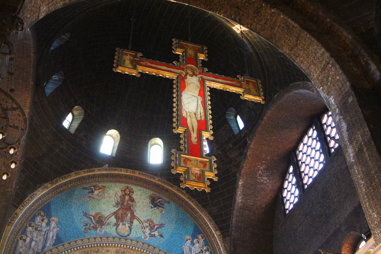 - 天井から吊られた10mの十字架、小部屋の壁画にモザイク画…