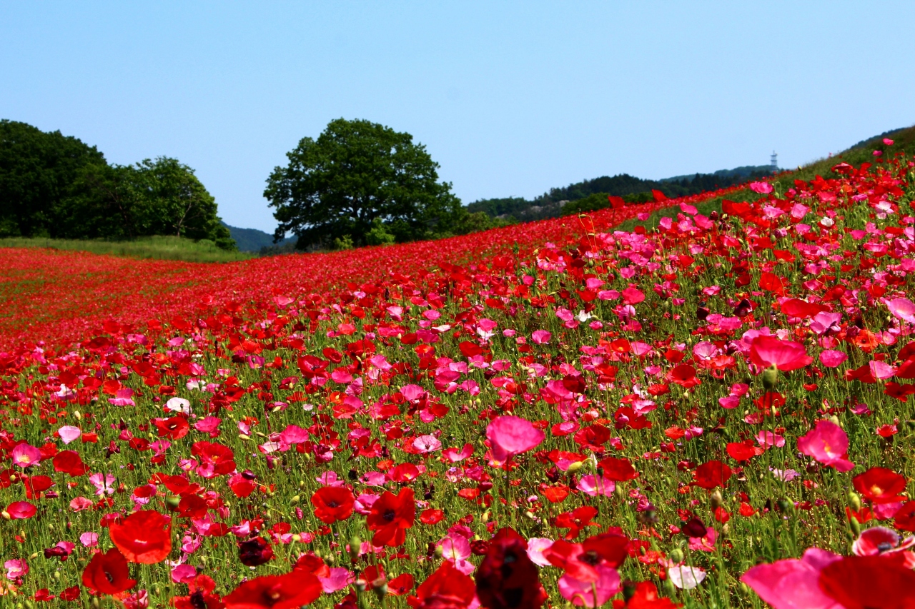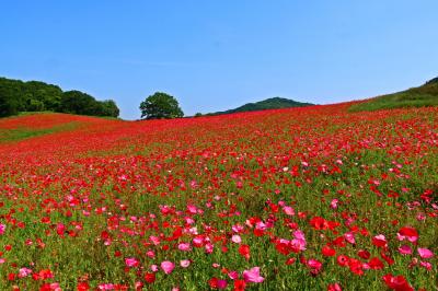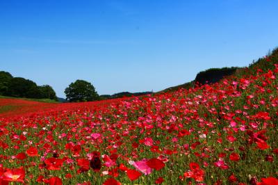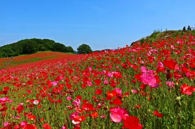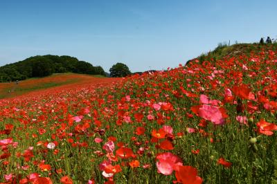青い空と緑の山並み、そして深紅のポピーの絨毯は、なかなか他では見ることのできない光景です。