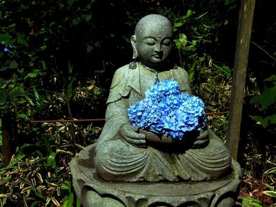 そんな青色の紫陽花を抱くお地蔵さま。