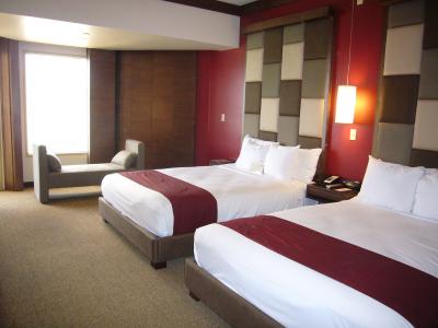 お部屋はすごくキレイにシックな感じに生まれ変わりました。ダブルベット2つあってもお部屋はゆったり使えます。テレビも液晶が付いてましたよ。