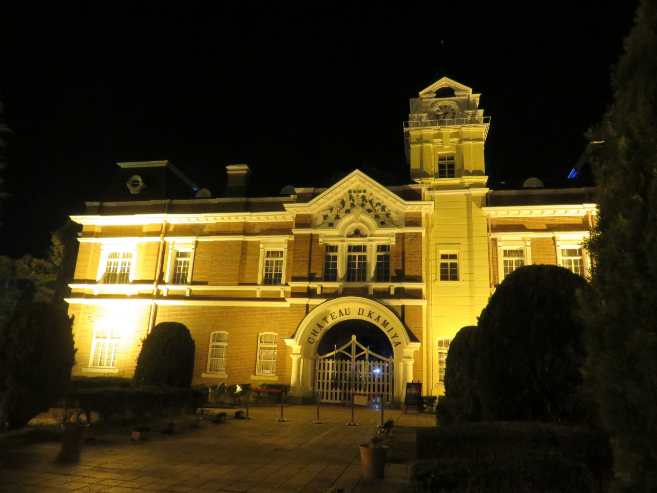 今回は、特別なイベントでした。国の重要文化財に指定されている本館の震災後の修理が完了したということで、この建物に映して上映されるプロジェクションマッピングが、二晩限定で行われました。地元の方から教えてもらって行ってきました。なかなか見ごたえあり、かつ地元愛にあふれる内容でとても良かったです。普段はバーベキューガーデンになるところで、物販もあり、寒かったですが、シャトーカミヤさんにクラフトビールを飲んできました。ライトアップされた本館建物もとても美しかったです。