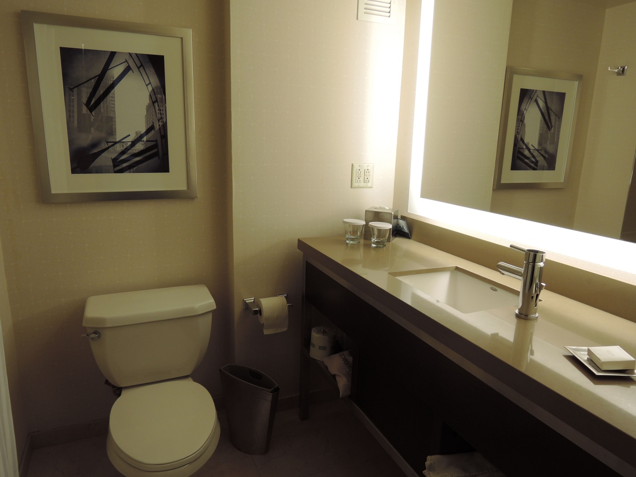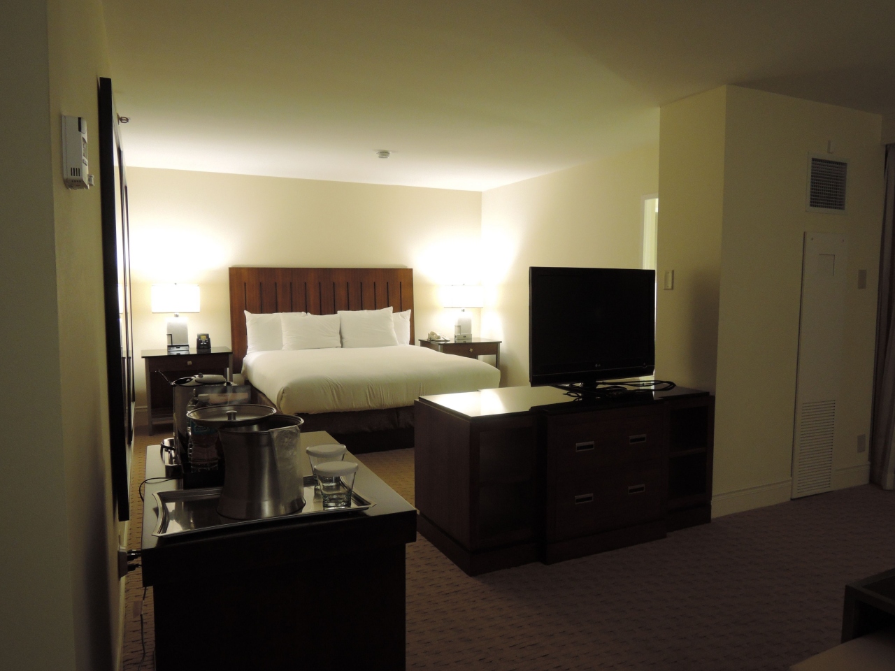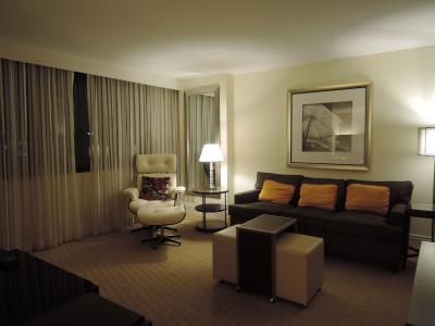 クルーズ旅行の前泊として宿泊しました。空港からシャトルバスがあります。空港の出口を出て、ホテルシャトルと書いてあるレーンで適当に待っていると、色々なホテルや民間駐車場のシャトルバスが周回してきます。ヒルトンのマークをつけたバスが見えたら、手を上げれば止まってくれます。こんなんで大丈夫?と思いますが、意外に運転手さんは、ゆっくりと注意深く見ています。夜23時頃の到着でしたが、特に危ないこともありませんでした。夜遅い到着だったため、ホテルのバーなども閉店してしまって、部屋でミニバーのビールを飲みました。ヒルトンオーナーズ特典で、なんとかスィートにアップグレードされたこともあり、大変広い部屋でした。