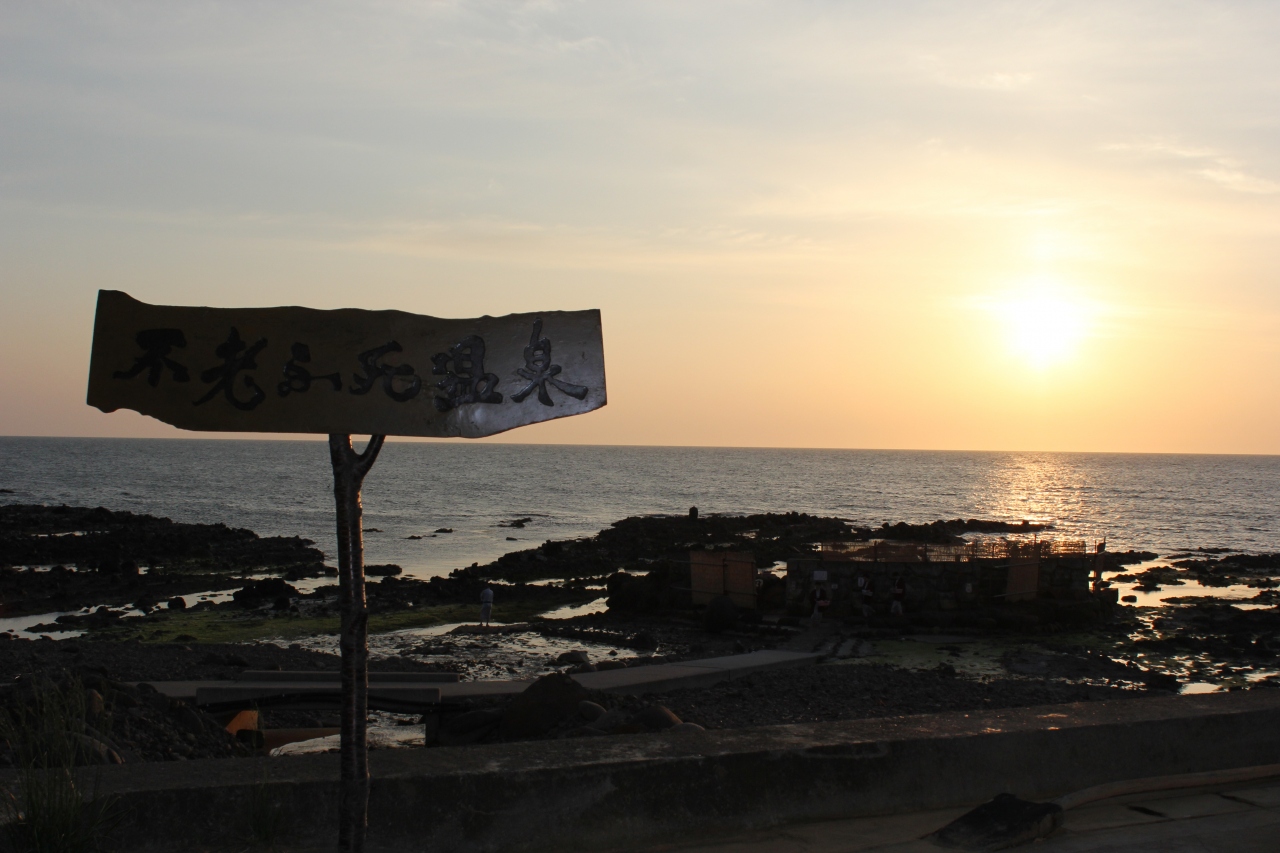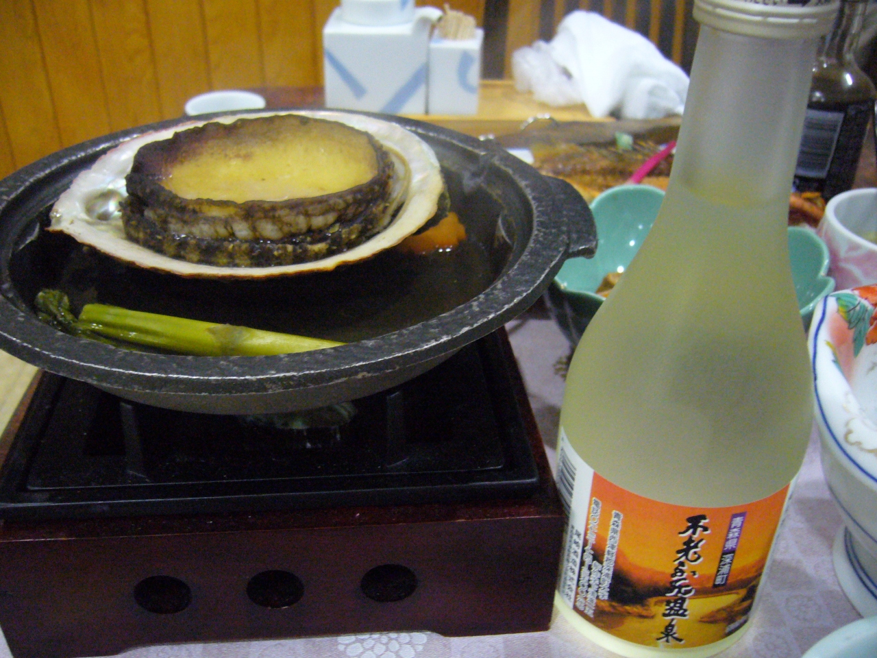 とても良く晴れた日だったので、海岸の露天風呂につかりながら、サンセットを迎えました。露天風呂には、とてもたくさんの人が入っていましたが、みんな和気あいあいとお話いながら、日没を待っていました。夕食は、あわびつきのプランにし、蒸し焼きアワビを食べました。美味しかった。
