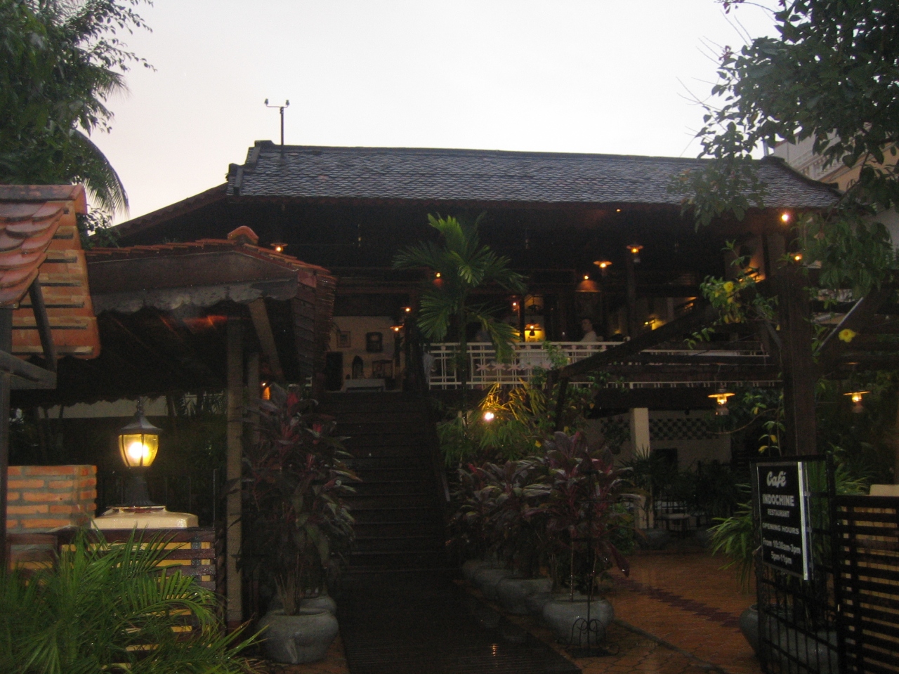 シュエムリアップのメーンストリート、シヴォタ通りにあるカンボジアの古い高床式の一軒家レストラン、カフェーインドシンに入りました。