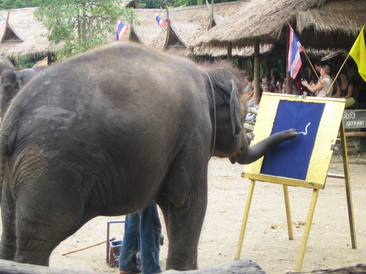 右手にあるお土産店には、象をかたちどった通常のお土産品の他に、変わったところでは、象のふんで作った再生紙そして象がお絵かきした絵など販売しています。