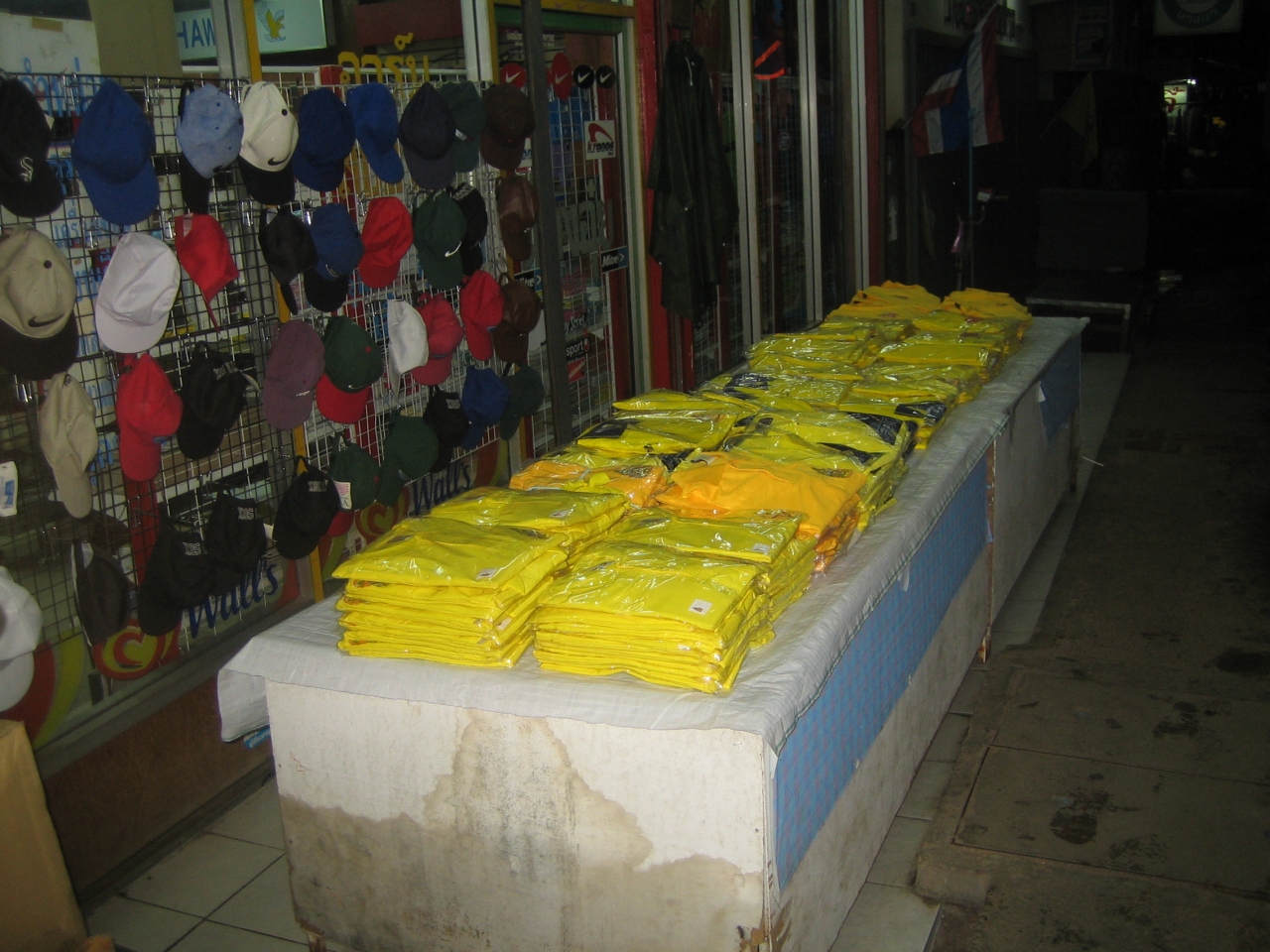店前にタイのプミポン国王・在位60周年記念用の黄色のシャツが並べられていた。- 旅行時期