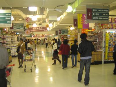 エスカレーターにて通路も広く買い物がしやすい、地下のスーパー・ロータスに降ります。