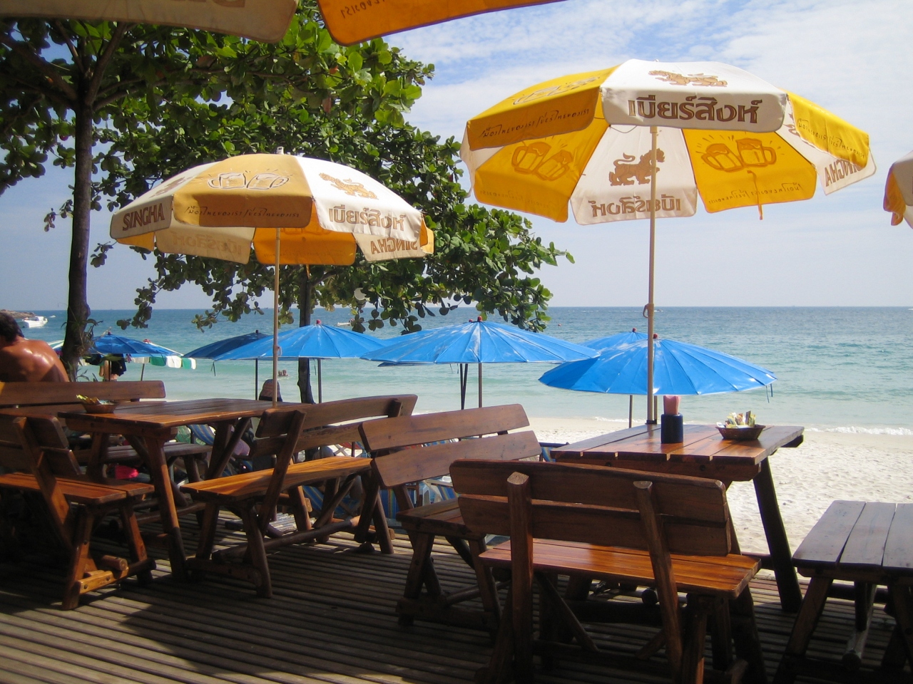 サイケーオビーチの北の端にある、黄色と白色のシンハービールのパラソルが鮮やかな、オンザビーチのレストランに入った。