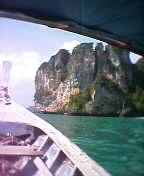 クラビタウンのチャオ・ファ-埠頭からロングテ−ルボ−トにのりプラナン半島へいく道中、船内はファランバックパッカ-が8名そして本官、携帯電話(カメラ)を持ってふらふ〜らと右左に移動していたら、船頭に船がかたむくのでじっとしときなさいとのジェスチャ-にて注意された。