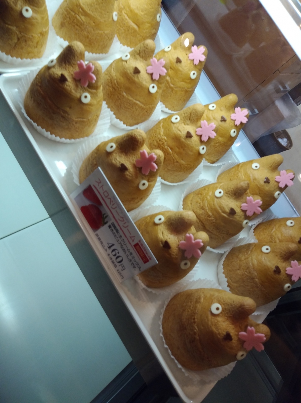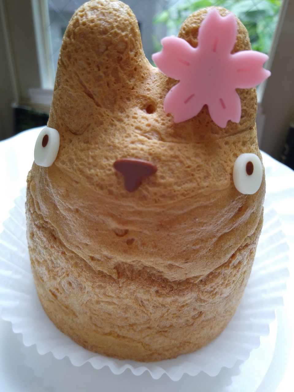 看板、入口からトトロのお出迎え。テンションあがります!朝イチだったので、シュークリームが美しく並んでました。店員さんに断って撮影させてもらいました。