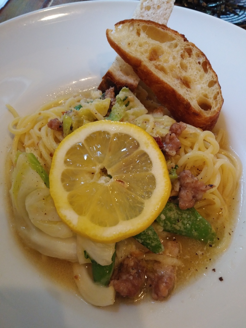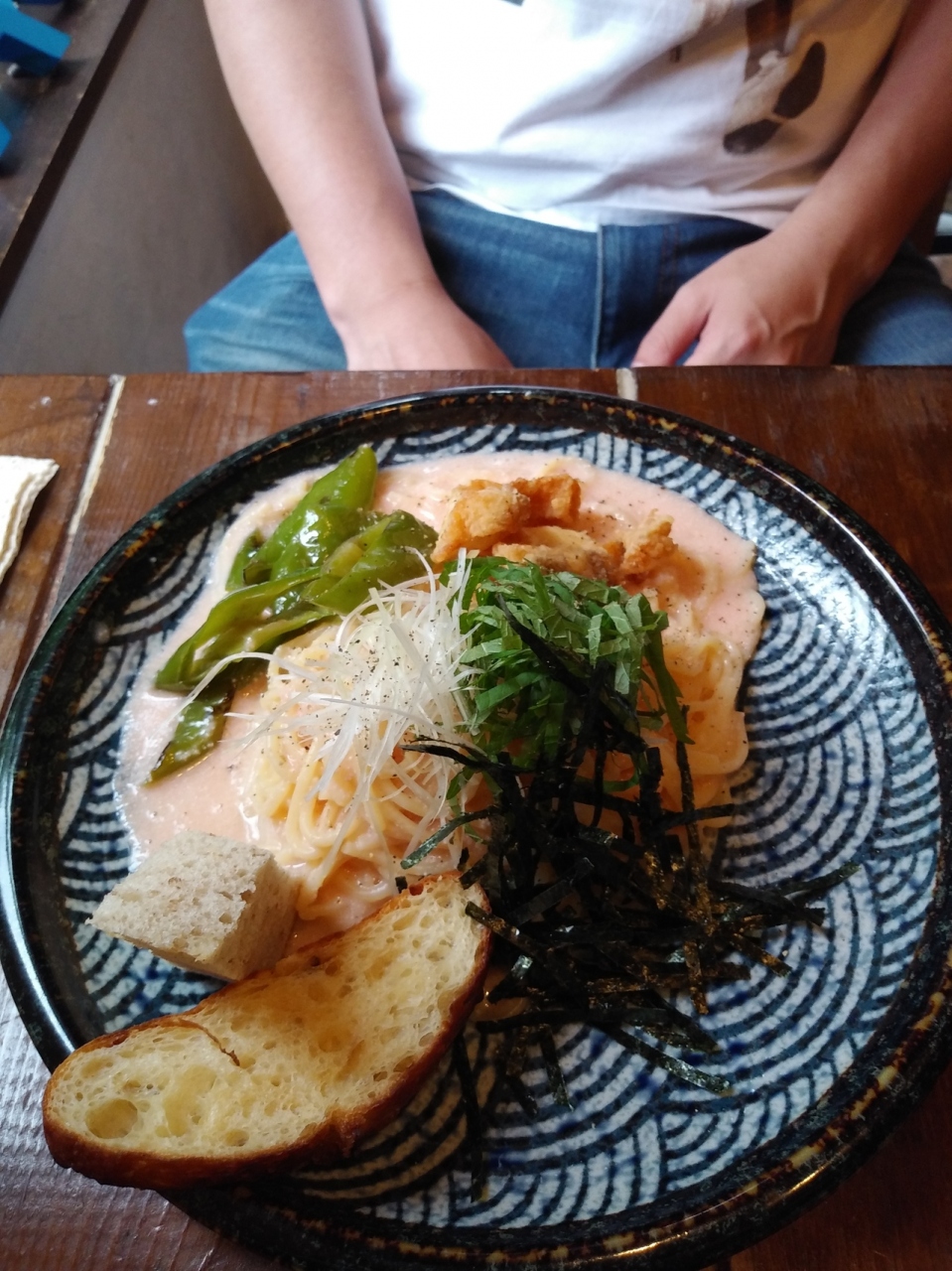 カフェでパスタランチとシュークリームを予約していたので、二階へ移動。パスタは生パスタで本格的でとてもおいしい!明太子クリームが特においしかったです。付け合わせのパンもおいしかったです。